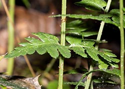 Crested Wood Fern's basal pinnae are blunt and triangular, and its upper pinnae are nearly opposite one another. It has narrow, erect fertile fronds.
