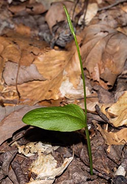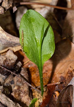 The fertile blade on Southern Adder's Tongue is widest at the base where it meets the stem. This is the best way to distinguish it from Northern Adder's Tongue (Ophioglossum pusillum), which is widest at the midpoint of the blade.