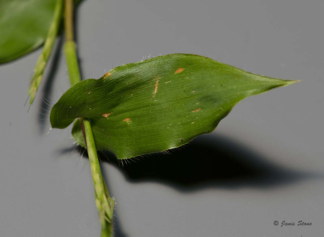 Small Carpetgrass is sometimes confused (especially before flowering) with Japanese Stiltgrass (Microstegium vimineum) and Wavyleaf Basketgrass (Oplismenus undulatifolius). Small Carpetgrass has distinctly cordate-clasping leaves, which Japanese Stiltgrass lacks. Also, while the leaves of Wavyleaf Basketgrasss may superficially appear to be cordate-clasping, they are not, plus they are more undulate.