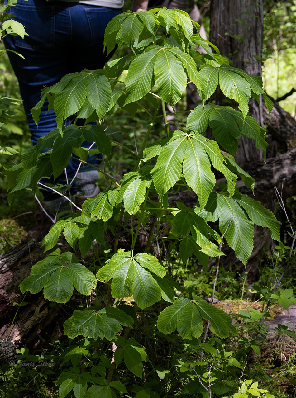 Common Buckeye is one of the largest, most massive, and commonly encountered trees in Southern Appalachian coves, recognizable in winter by the bark of large plate-like slabs, thick twigs, and massive form. In spring and summer, look for its opposite palmately-compound leaves; its leaves usually turn orange to red in the fall.