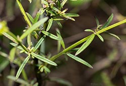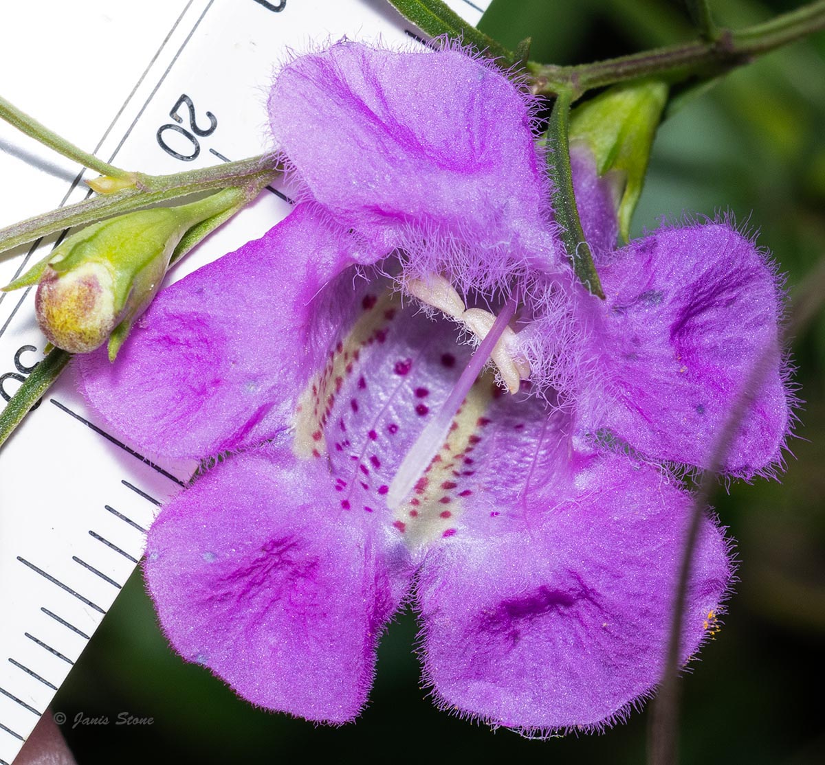 Purple False Foxglove has bright rose-purple flowers with yellow-lined corolla throats. The flowers are held up by pedicels that are less than 1.5 times as long as their calyx and it has green leaves, which makes it readily distinguished from Slender False Foxglove (Agalinis tenuifolia).