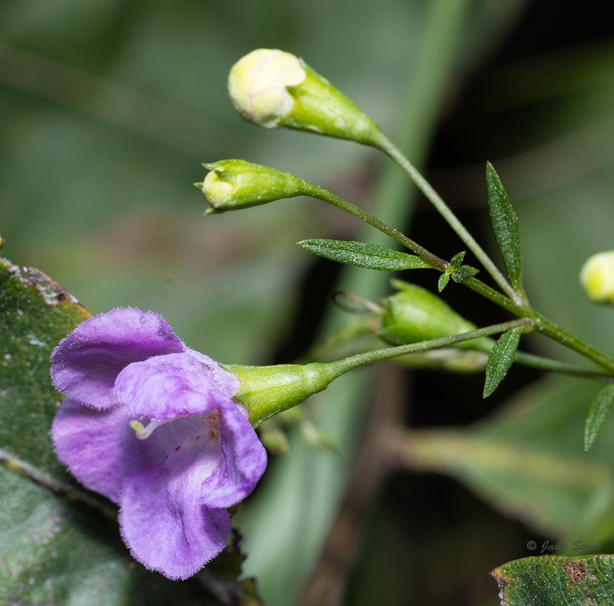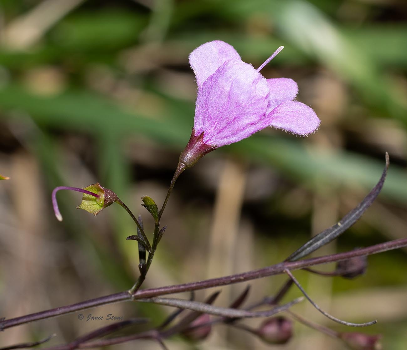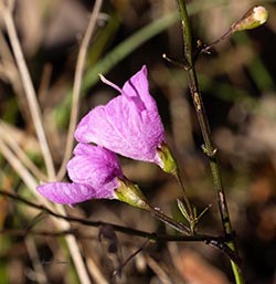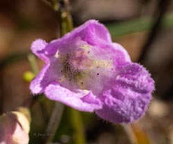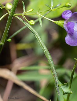 Slender False Foxglove is named for its narrow leaves, which have a purplish pigment. Its purple flowers are held up by pedicels that are more than 2.5 times as long as their calyx, and the upper lip of the corolla is arched forward over the stamens (not erect or reflexed). The corolla throat is glabrous or nearly so.