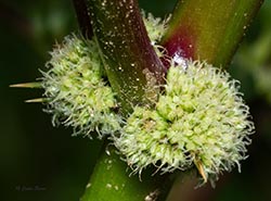 Spiny Amaranth, true to its common name, has spikes present on the flowers and spines present at nodes. Its flowers are green, lack petals, and have terminal and axillary spikes. Male flowers are at the end of the flower spike, while the female flowers are at the bottom.