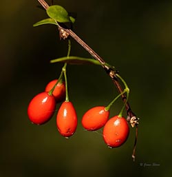 While Japanese Barberry's bright red fruits might look cheerful in winter, its actually a nasty little non-native shrub. Because of its dense, compact form and sharp spines, it provides a safe haven for mice carrying deer ticks infected with Lyme disease. Its leaves are smooth (entire) and it has mostly single thorns. These traits allow it to be readily distinguised from the native American Barberry (Berberis canadensis) which has bristly serrate leaves and mostly trifurcate thorns. Japanese Barberry fruits persist through winter unless eaten by wildlife.