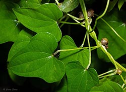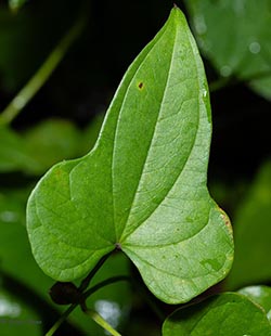 Chinese Yam is a twining vine that is native to East Asia. Its has alternate or 3-whorled leaves that are halberd-shaped, unlike the cordate-to-ovate shape of Wild Yam (Dioscorea villosa)'s leaves. It also forms small potato-like aerial tubers on its stems, which Wild Yam never does.