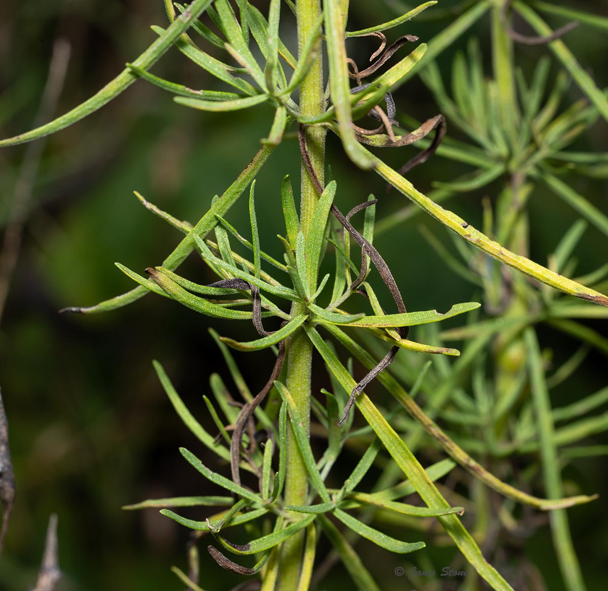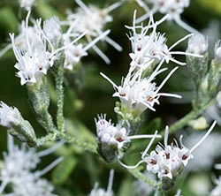 Hyssop-leaf Thoroughwort's leaves are long and narrow, and are toothless or nearly so, and are borne in whorls.