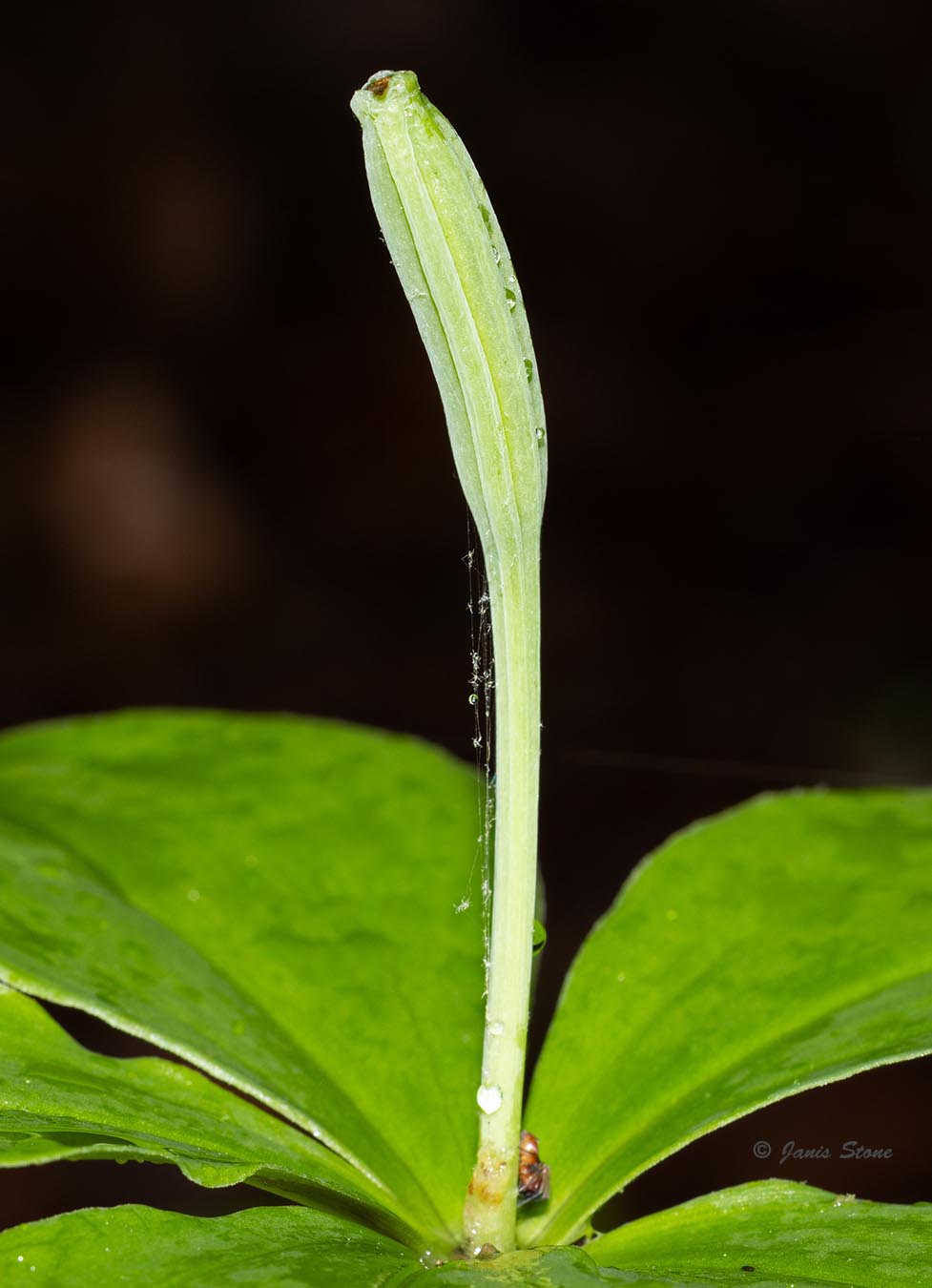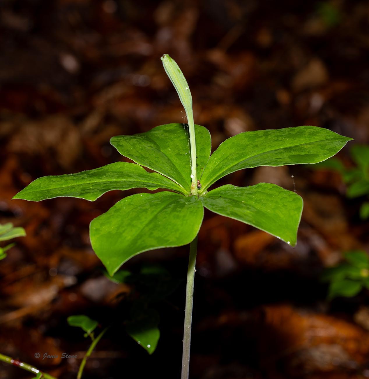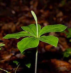 Although superficially resembling Cucumber Root (Medeola virginiana), it bears its single flower above a single set of whorled leaves (usually 5 leaves, but it can have 3-6). Also, its stem is glabrous, unlike Cucumber Root's pubescent and somewhat wiry stem.