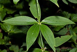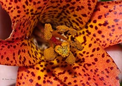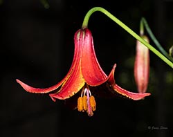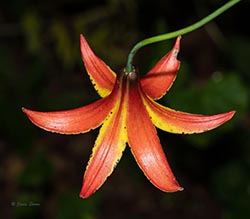 Canada Lily's nodding flowers range in color from brick-red to yellow. Its tepals are reflexed from their middle and have purple or brown spots on the inside for at least half of their length. Its leaves are typically in wholes of 415 leaves along the stem.
