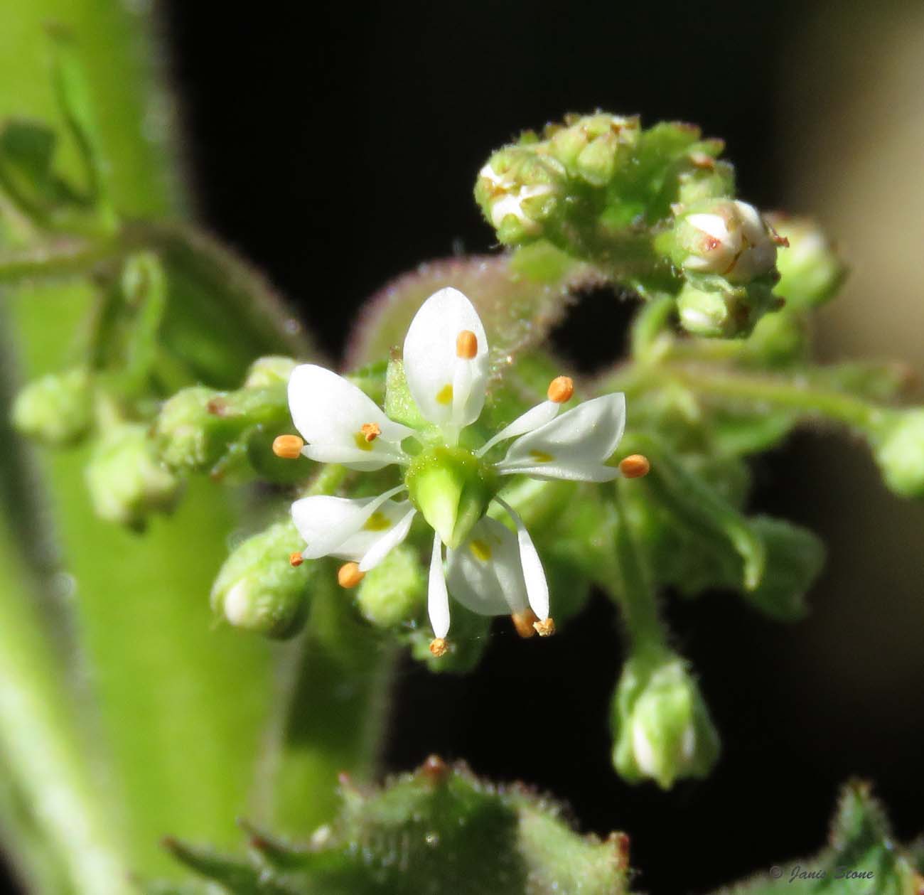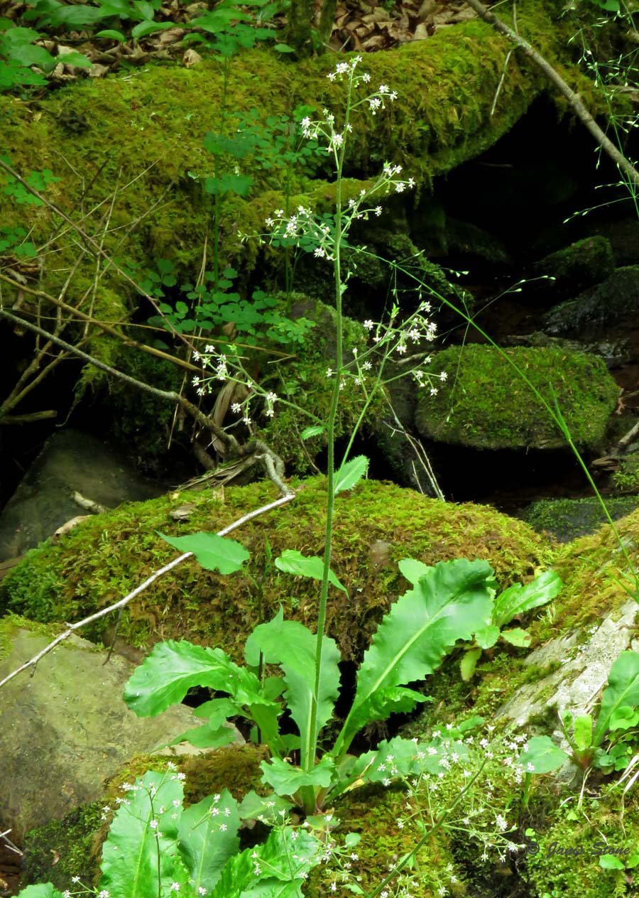 Lettuceleaf Saxifrage has basal leaves, with flowers borne in clusters on the top of leafless stems.