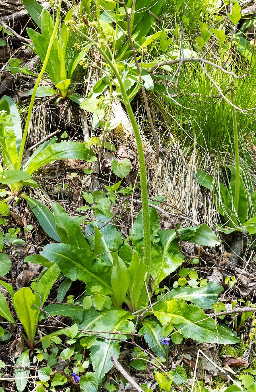 Like all of the species in the genus Micranthes, Swamp Saxifrage has basal leaves, with flowers borne in clusters on the top of leafless stems. It's flower petals lack yellow spots, but may have a yellow tinge. It's leaves have smooth or slightly toothed, 5-35cm long, and have conspicuous midribs. Swamp Saxifrage typically grows in forested seeps and seepage swamps.