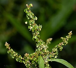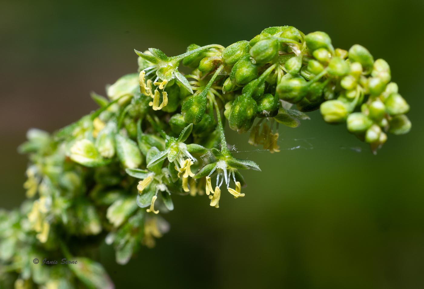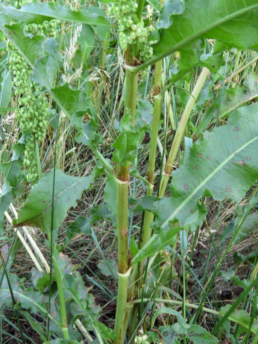 Curly Dock has large (1435 cm long) leaves with distinctive curly/waved edges. Its flowering stalk bolts up in late spring from a rosette of basal leaves. Each yellowish or reddish green flower is about 3mm long and consists of 3 inner sepals, 3 outer sepals, 3 styles, and an ovary. Each plant has both perfect (bisexual) and pistillate (female), which also have 6 stamens.