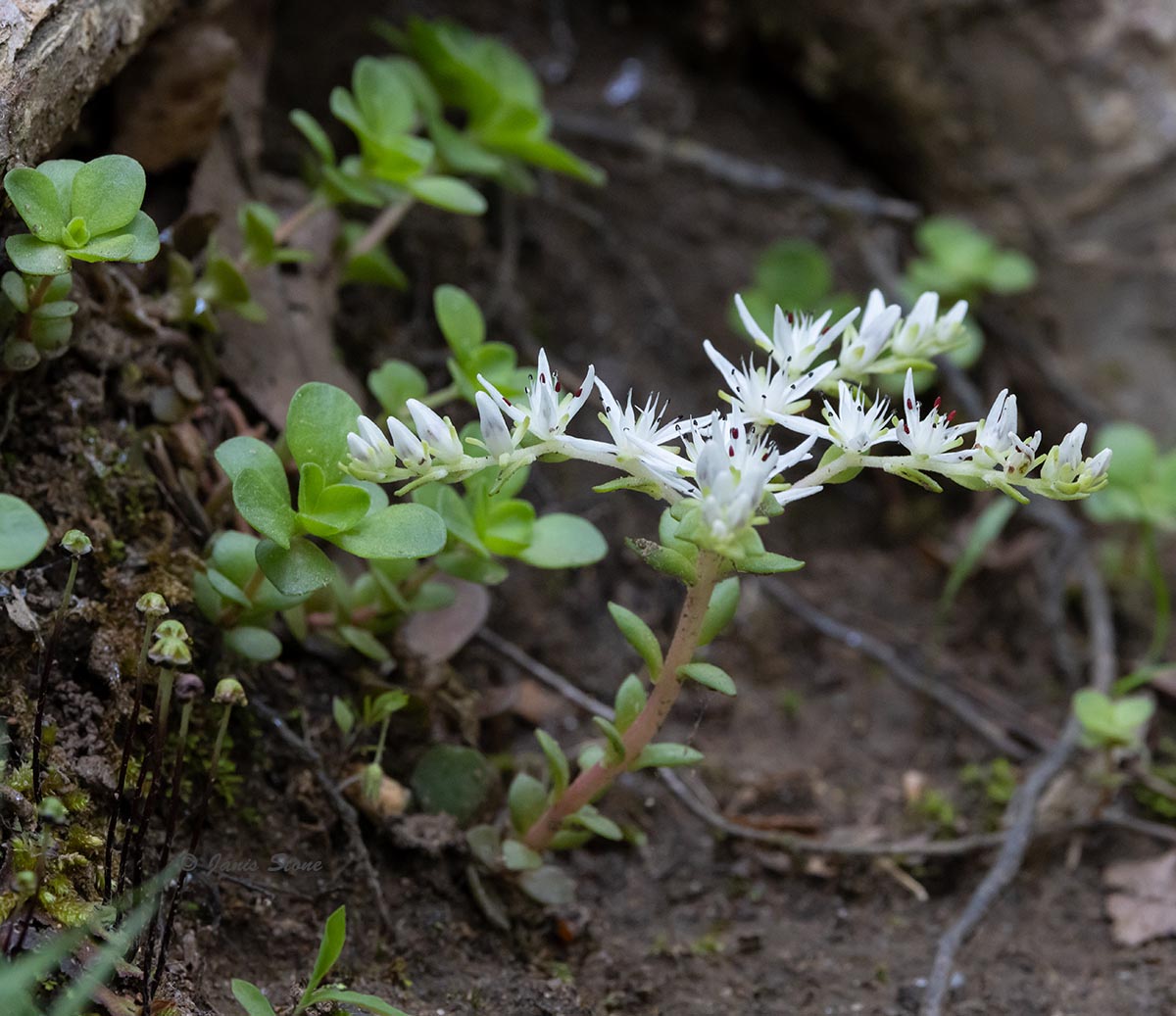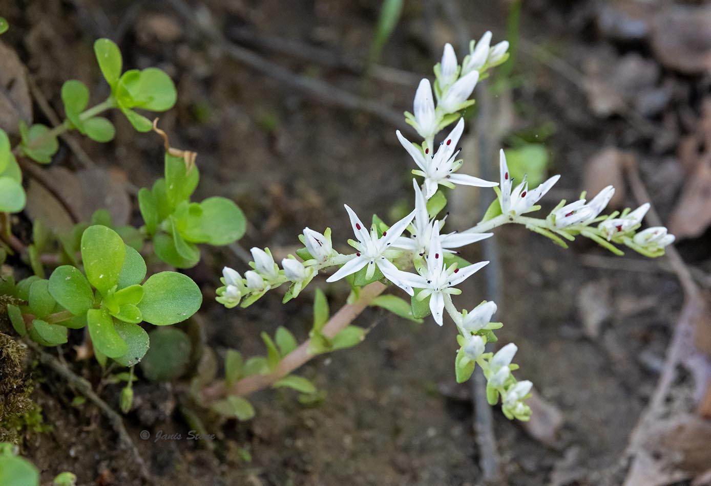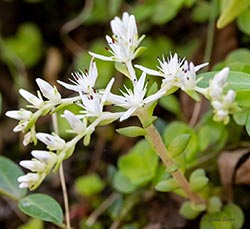 Wild Stonecrop has white flowers, and succulent leaves whorled in groups of three.