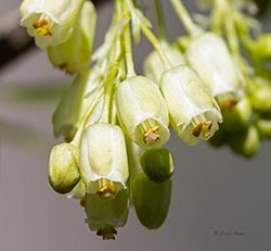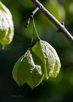 Bladdernut's most distinctive characteristic is the bladder-like shape of its fruits, hanging like small pale lanterns in its branches. Leaves are opposite and divided into three leaflets (looking disturbingly at first glance like Poison Ivy!), with each leaflet up to 10 cm long and 5 cm broad, with a finely serrated margin. The leaves are bright green in the spring, turning dark green in the summer.
