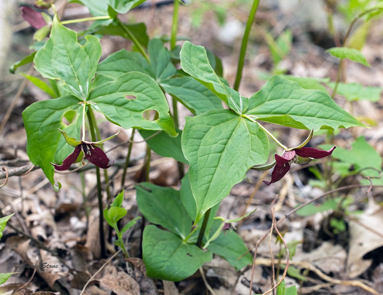 Red Trillium has one nodding flower, with an unpleasant odor (hence the alternative common name Stinking Benjamin). Note that its flowers have a long (1-9cm) pedicel.