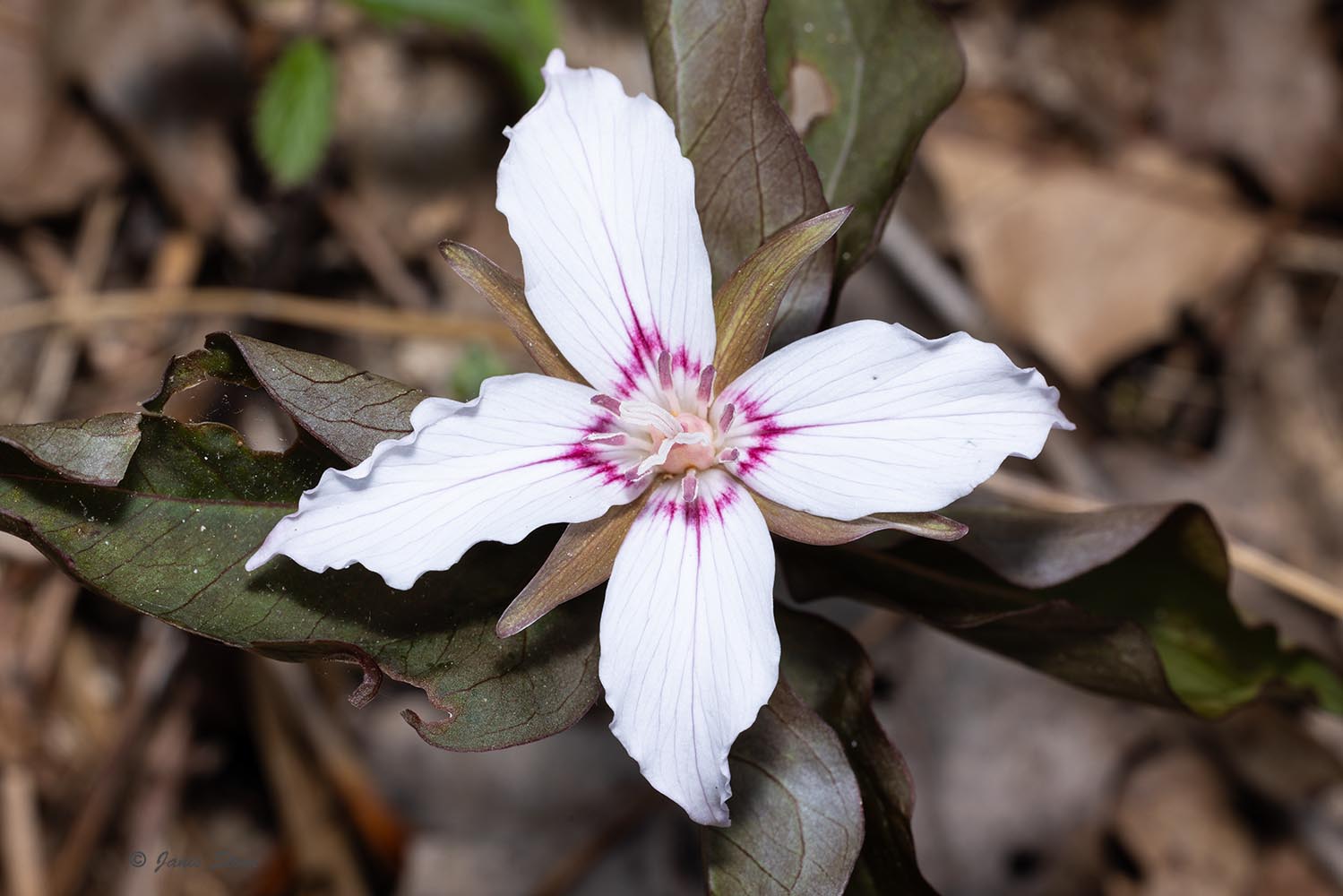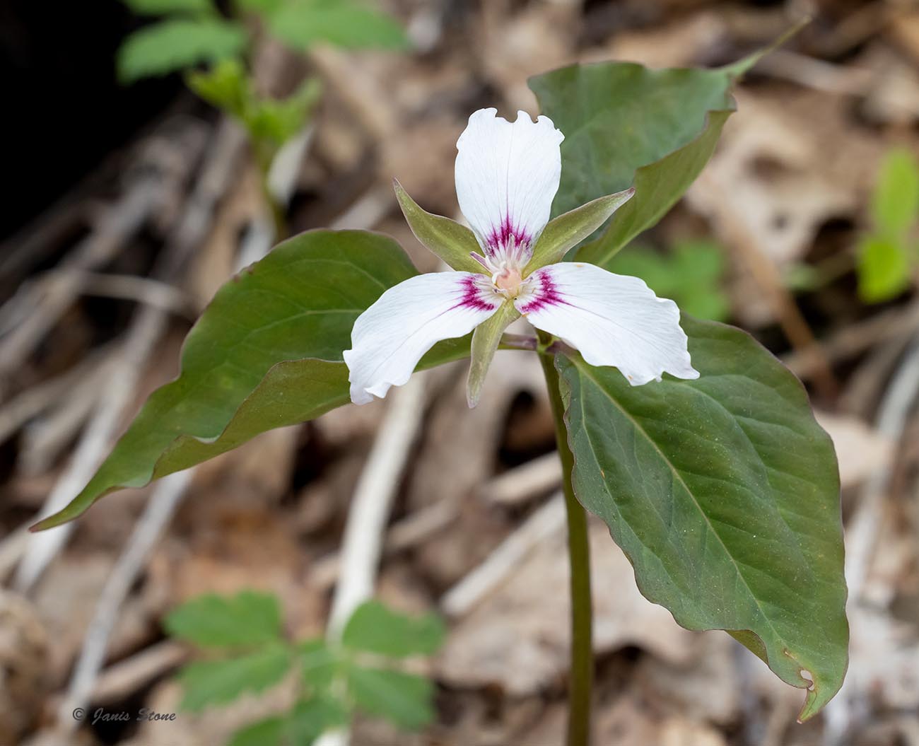 Painted Trillium's Latin species name undulatum means wavy, referring to its petals' wavy margins. Its petals are white, typically with an inverted red "V" near their base (rarely, some specimens may lack the red "V").