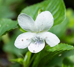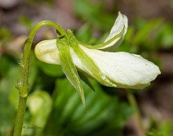 Cream Violets' open corollas of are completely ivory- or cream-colored, with blue, to brown-purple, to purple veins near their base. Its stems are ascending-to-erect at the time of flowering and fruiting, and its leaves are hairless or nearly so.